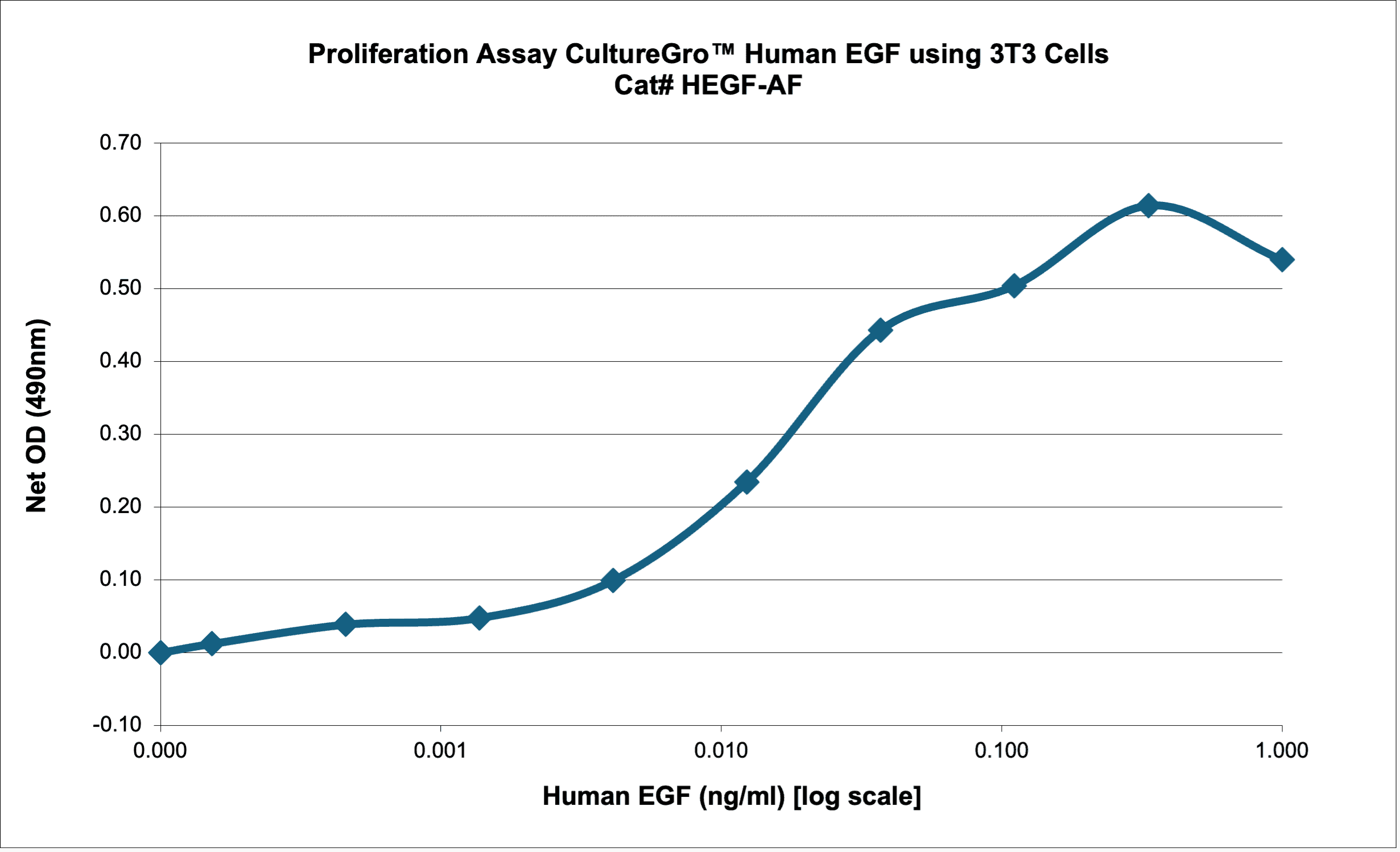 Activity: The ED50 was determined by a cell proliferation assay using balb/c 3T3 cells is ≤ 0.1 ng/ml, corresponding to a specific activity of ≥ 1 x 10^7 units/mg.