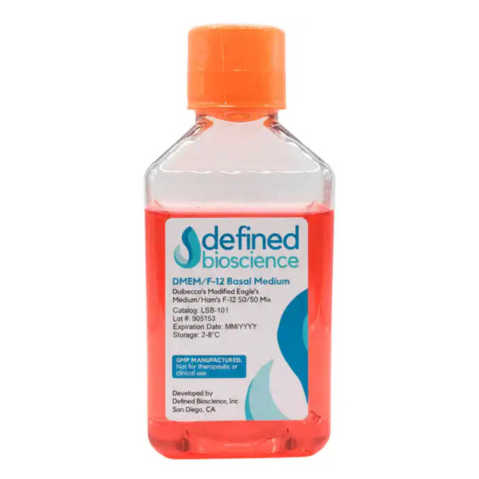 Defined Bioscience’s DMEM/F12 is a fully defined basal medium for use in the culture of a wide range of mammalian cells. DMEM/F12 is a 1:1 mixture of DMEM and Ham’s F-12, providing an optimized environment for a broad range of cell types. Our DMEM/F12 is buffered with HEPES and sodium bicarbonate, offering a comprehensive buffering system which helps to maintain pH stability and minimize the effect of CO2 fluctuations in standard incubator conditions for mammalian cell culture. Additionally, this formulation includes L-alanyl-L-glutamine in place of glutamine, which enhances cell metabolism and reduces the risk of cell death, while also improving medium stability and cell culture consistency.